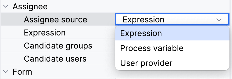 In Jmix BPM, the assignee source refers to the mechanism used to determine which way the user will be selected to be an assignee for a specific user task in a business process. There are three options, how to do that:
