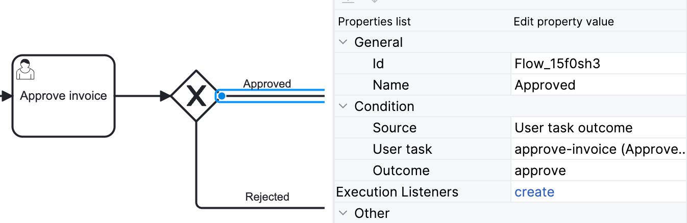 To specify conditions for the approved sequence flow, select it on the canvas and configure its properties.