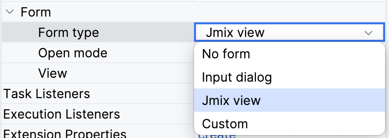 Select an element on the canvas. Then, in the BPMN Inspector panel, set the form type to Jmix view.