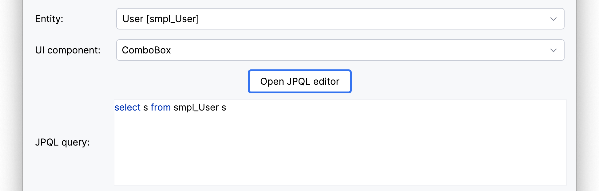 <jmix:formFieldProperty name="query" value="select e from smpl_Order e where e.amount > 1000" />