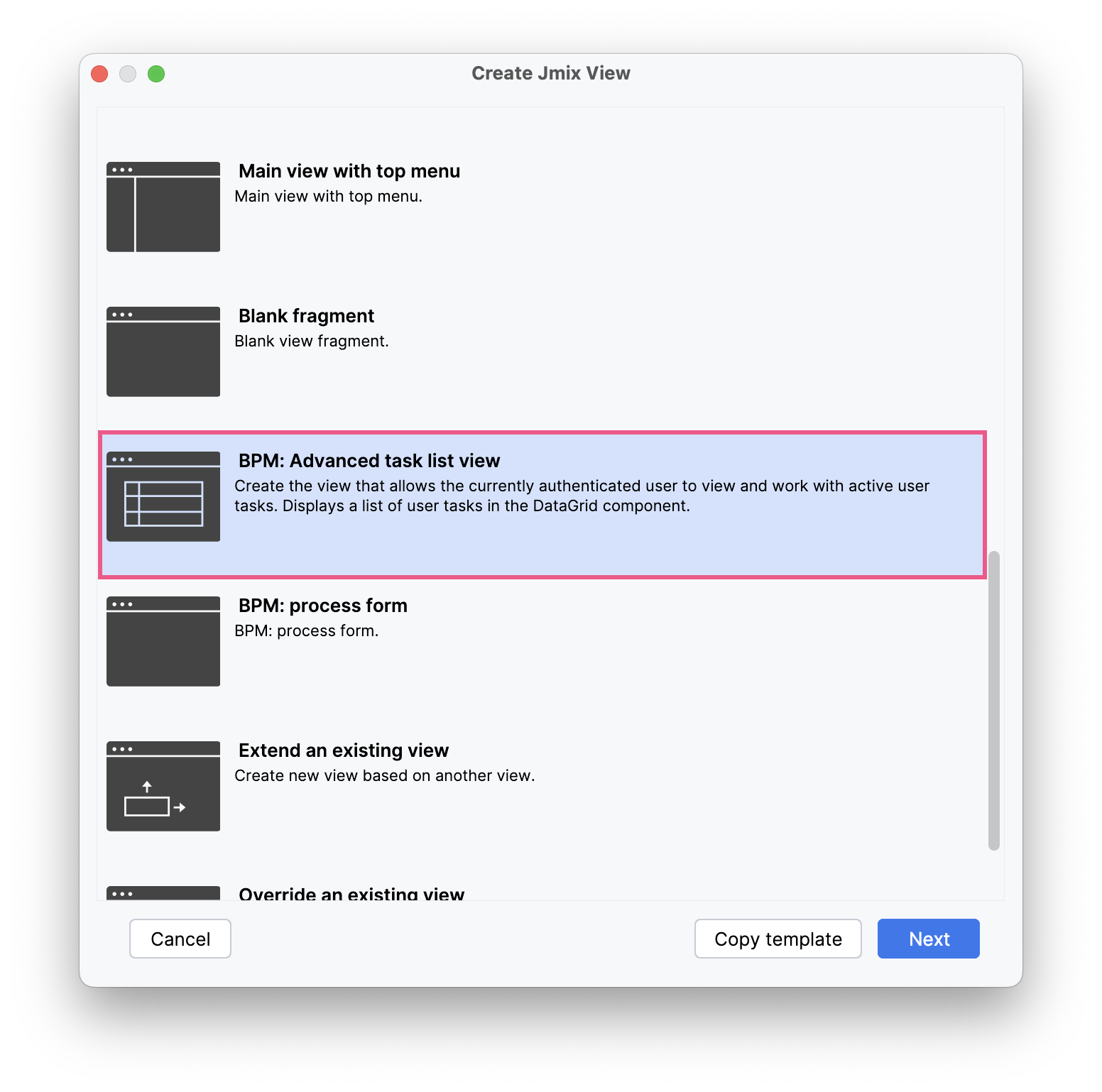 The process of creating an alternative task screen is similar to creating other screens in the Jmix application. The xref:studio:view-wizard.adoc in Jmix Studio provides the BPM: Advanced Task List View template.