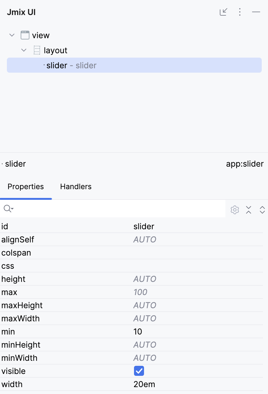 app-ui-components.xsdfile and define the XML markup for the component:<xs:schema xmlns="http://company.com/schema/app-ui-components" elementFormDefault="qualified" targetNamespace="http://company.com/schema/app-ui-components" xmlns:xs="http://www.w3.org/2001/XMLSchema" xmlns:layout="http://jmix.io/schema/flowui/layout"> <xs:element name="slider"> <xs:complexType> <xs:complexContent> <xs:extension base="layout:baseComponent"> <xs:attribute name="min" type="xs:integer"/> <xs:attribute name="max" type="xs:integer"/> <xs:attributeGroup ref="layout:hasSize"/> </xs:extension> </xs:complexContent> </xs:complexType> </xs:element> </xs:schema> -