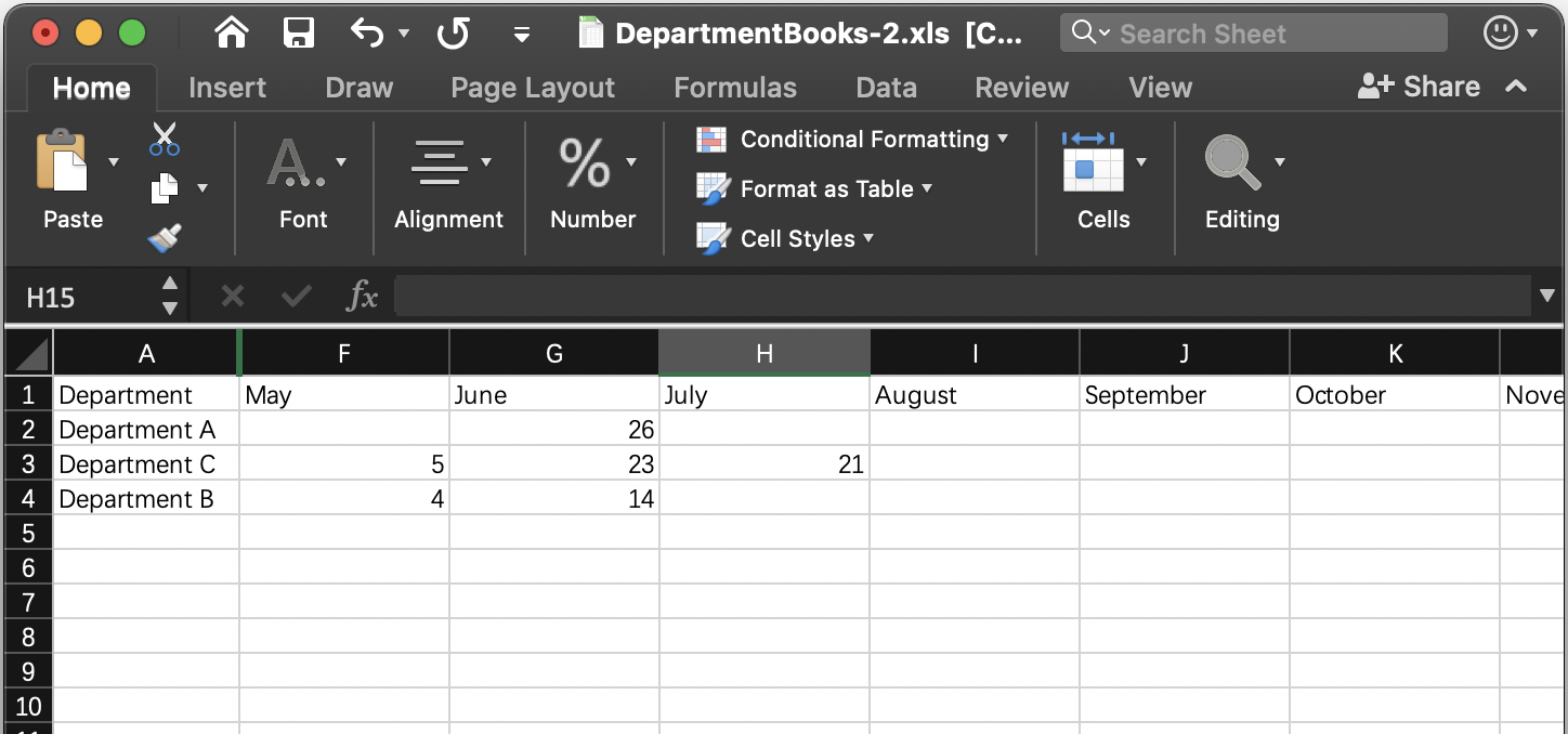 In this example, we will create a crosstab report for the library departments, to list how many books each department purchased every month. The report is extended both vertically and horizontally and aggregates the book amounts for each department and each month: