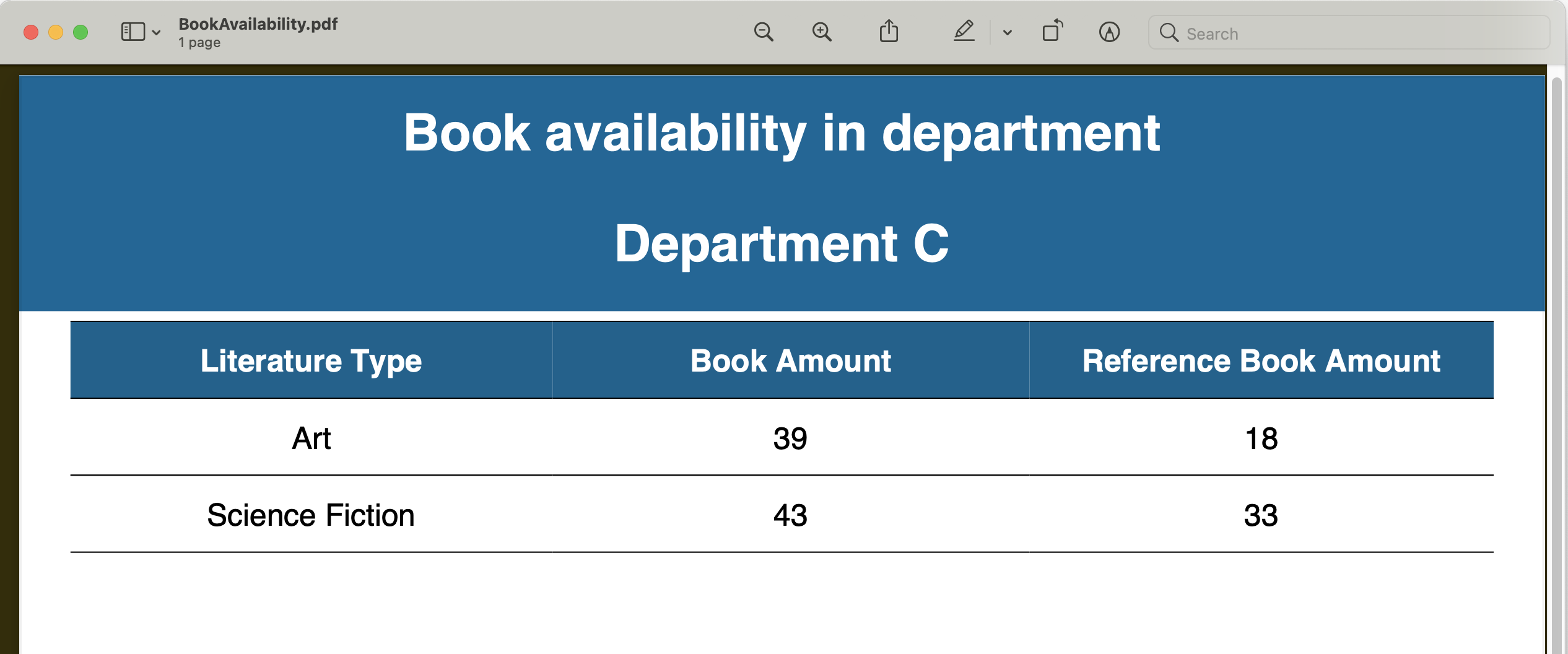 <?xml version="1.0" encoding="UTF-8"?> <!-- Created with Jaspersoft Studio version 6.4.0.final using JasperReports Library version 6.4.1 --> <jasperReport xmlns="http://jasperreports.sourceforge.net/jasperreports" xmlns:xsi="http://www.w3.org/2001/XMLSchema-instance" xsi:schemaLocation="http://jasperreports.sourceforge.net/jasperreports http://jasperreports.sourceforge.net/xsd/jasperreport.xsd" name="books" pageWidth="595" pageHeight="842" whenNoDataType="AllSectionsNoDetail" columnWidth="535" leftMargin="20" rightMargin="20" topMargin="20" bottomMargin="20"> <property name="template.engine" value="tabular_template"/> <property name="com.jaspersoft.studio.data.defaultdataadapter" value="One Empty Record"/> <style name="Table_TH" mode="Opaque" backcolor="#066990"> <box> <topPen lineWidth="0.5" lineColor="#000000"/> <bottomPen lineWidth="0.5" lineColor="#000000"/> </box> </style> <style name="Table_CH" mode="Opaque" forecolor="#FFFFFF" backcolor="#06618F" hTextAlign="Center" fontSize="12"> <box> <topPen lineWidth="0.5" lineColor="#000000"/> <bottomPen lineWidth="0.5" lineColor="#000000"/> </box> </style> <style name="Table_TD" mode="Opaque" backcolor="#FFFFFF" hTextAlign="Center"> <box> <topPen lineWidth="0.5" lineColor="#000000"/> <bottomPen lineWidth="0.5" lineColor="#000000"/> </box> </style> <subDataset name="Data"> <field name="literature_type_name" class="java.lang.String"/> <field name="books_instances_amount" class="java.lang.Long"/> <field name="reference_books_instances_amount" class="java.lang.Long"/> </subDataset> <field name="library_department_name" class="java.lang.String"/> <title> <band height="72"> <frame> <reportElement mode="Opaque" x="-20" y="-20" width="595" height="92" backcolor="#006699"/> <staticText> <reportElement x="20" y="10" width="555" height="30" forecolor="#FFFFFF"/> <textElement textAlignment="Center"> <font size="20" isBold="true"/> </textElement> <text><![CDATA[Book availability in department]]></text> </staticText> <textField> <reportElement x="20" y="50" width="555" height="30" forecolor="#FFFFFF"/> <box> <pen lineWidth="1.0" lineColor="#FFFFFF"/> <topPen lineWidth="0.0" lineStyle="Solid" lineColor="#000000"/> <leftPen lineWidth="0.0" lineStyle="Solid" lineColor="#000000"/> <bottomPen lineWidth="0.0" lineStyle="Solid" lineColor="#000000"/> <rightPen lineWidth="0.0" lineStyle="Solid" lineColor="#000000"/> </box> <textElement textAlignment="Center" verticalAlignment="Middle"> <font fontName="SansSerif" size="20" isBold="true"/> </textElement> <textFieldExpression><![CDATA[$F{library_department_name}]]></textFieldExpression> </textField> </frame> </band> </title> <detail> <band height="204"> <componentElement> <reportElement x="0" y="4" width="555" height="200" forecolor="#FFFFFF"> <property name="com.jaspersoft.studio.layout" value="com.jaspersoft.studio.editor.layout.VerticalRowLayout"/> <property name="com.jaspersoft.studio.table.style.table_header" value="Table_TH"/> <property name="com.jaspersoft.studio.table.style.column_header" value="Table_CH"/> <property name="com.jaspersoft.studio.table.style.detail" value="Table_TD"/> <property name="net.sf.jasperreports.export.headertoolbar.table.name" value=""/> <property name="com.jaspersoft.studio.components.autoresize.proportional" value="true"/> </reportElement> <jr:table xmlns:jr="http://jasperreports.sourceforge.net/jasperreports/components" xsi:schemaLocation="http://jasperreports.sourceforge.net/jasperreports/components http://jasperreports.sourceforge.net/xsd/components.xsd"> <datasetRun subDataset="Data"> <dataSourceExpression><![CDATA[$P{REPORTING}.dataset("Data")]]></dataSourceExpression> </datasetRun> <jr:column width="188"> <jr:columnHeader style="Table_CH" height="30"> <staticText> <reportElement x="0" y="0" width="188" height="30" forecolor="#FFFFFF"/> <box> <pen lineColor="#FFFFFF"/> </box> <textElement textAlignment="Center" verticalAlignment="Middle"> <font fontName="SansSerif" size="12" isBold="true"/> </textElement> <text><![CDATA[Literature Type]]></text> </staticText> </jr:columnHeader> <jr:detailCell style="Table_TD" height="30"> <textField> <reportElement x="0" y="0" width="188" height="30"/> <textElement textAlignment="Center" verticalAlignment="Middle"> <font fontName="SansSerif" size="12"/> </textElement> <textFieldExpression><![CDATA[$F{literature_type_name}]]></textFieldExpression> </textField> </jr:detailCell> </jr:column> <jr:column width="186"> <jr:columnHeader style="Table_CH" height="30"> <staticText> <reportElement x="0" y="0" width="186" height="30" forecolor="#FFFFFF"/> <textElement textAlignment="Center" verticalAlignment="Middle"> <font fontName="SansSerif" size="12" isBold="true"/> </textElement> <text><![CDATA[Book Amount]]></text> </staticText> </jr:columnHeader> <jr:detailCell style="Table_TD" height="30"> <textField> <reportElement x="0" y="0" width="186" height="30"/> <textElement textAlignment="Center" verticalAlignment="Middle"> <font size="12"/> </textElement> <textFieldExpression><![CDATA[$F{books_instances_amount}]]></textFieldExpression> </textField> </jr:detailCell> </jr:column> <jr:column width="181"> <jr:columnHeader style="Table_CH" height="30"> <staticText> <reportElement x="0" y="0" width="181" height="30" forecolor="#FFFFFF"/> <textElement textAlignment="Center" verticalAlignment="Middle"> <font fontName="SansSerif" size="12" isBold="true"/> </textElement> <text><![CDATA[Reference Book Amount]]></text> </staticText> </jr:columnHeader> <jr:detailCell style="Table_TD" height="30"> <textField isBlankWhenNull="false"> <reportElement x="0" y="0" width="181" height="30" forecolor="#000000"/> <textElement textAlignment="Center" verticalAlignment="Middle"> <font size="12"/> </textElement> <textFieldExpression><![CDATA[$F{reference_books_instances_amount}]]></textFieldExpression> </textField> </jr:detailCell> </jr:column> </jr:table> </componentElement> </band> </detail> <pageFooter> <band height="17"> <textField> <reportElement mode="Opaque" x="0" y="4" width