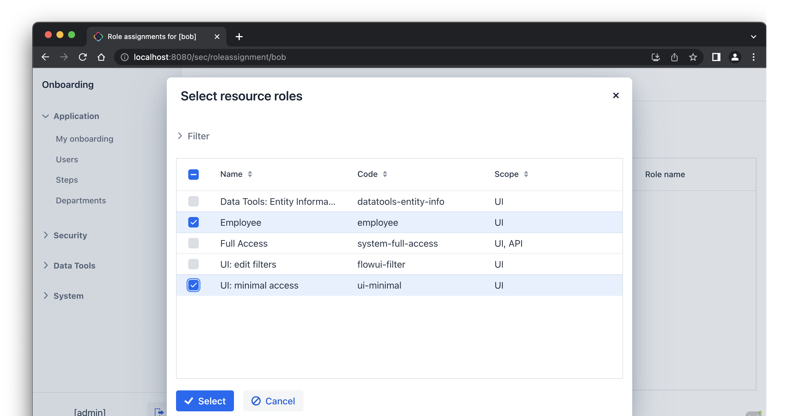 In the Select resource roles dialog, select Employee and UI: minimal access roles: