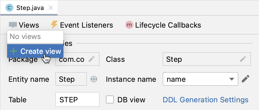 In the actions panel at the top of the entity designer, click Views → Create view: