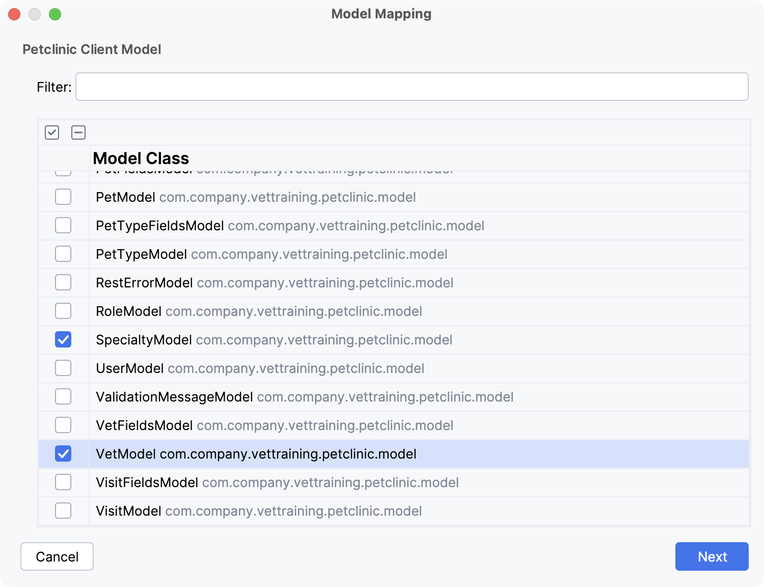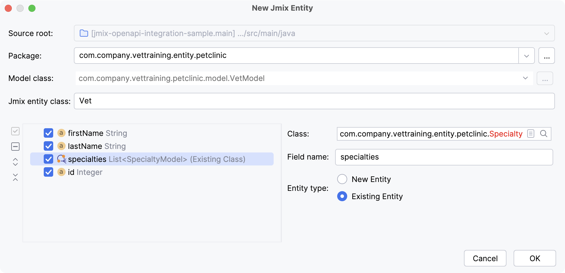 The Veterinary Training application will mirror a part of the PetClinic data model that is involved in the integration: Specialty